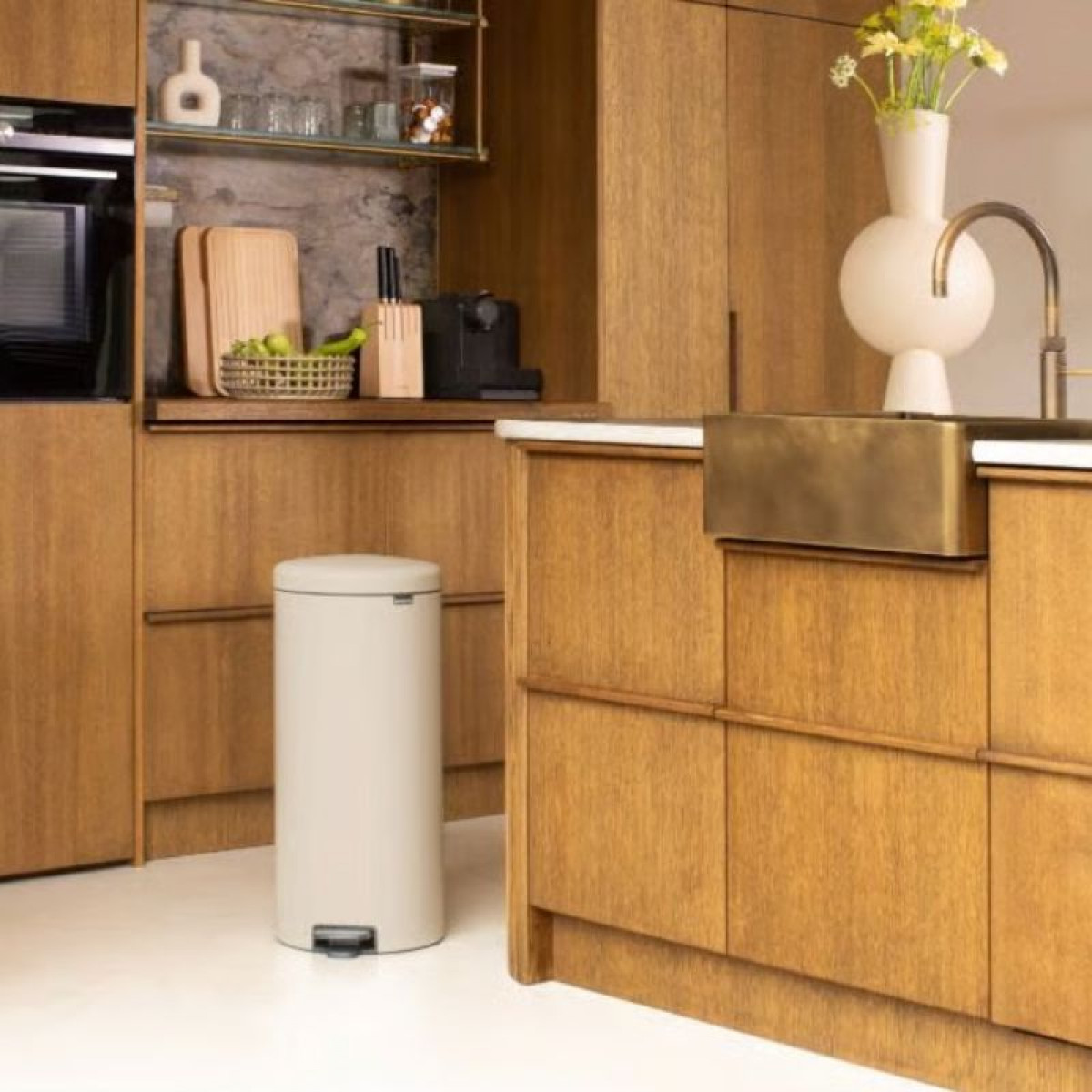 Šiukšlių dėžė atidaroma koja Brabantia NewIcon, smėlio spalvos, 30l - stilinga, elegantiška šiukšliadėžė, puikiai tinkanti tiek virtuvėje, tiek darbo kambaryje.